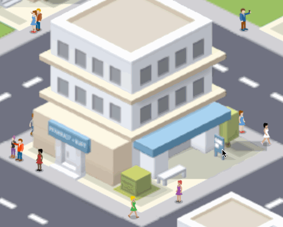 However, when it came to sorting pedestrian sprites that walk around buildings, I had to recalculate the z-depth for both buildings and pedestrians on every update so that pedestrians would appear in front and behind each building appropriately. This meant recalculating structures and pedestrians on each update(), and I could no longer cache structures as a single bitmap.