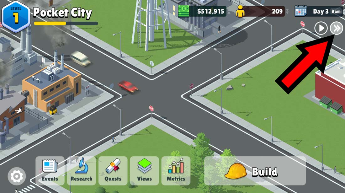 A fast-forward button lets you pass time faster. Pocket City has no incentive to keep the player waiting around (there are no pay-to-skip timers after all), so feel free to fast forward if you want zoom ahead in time!