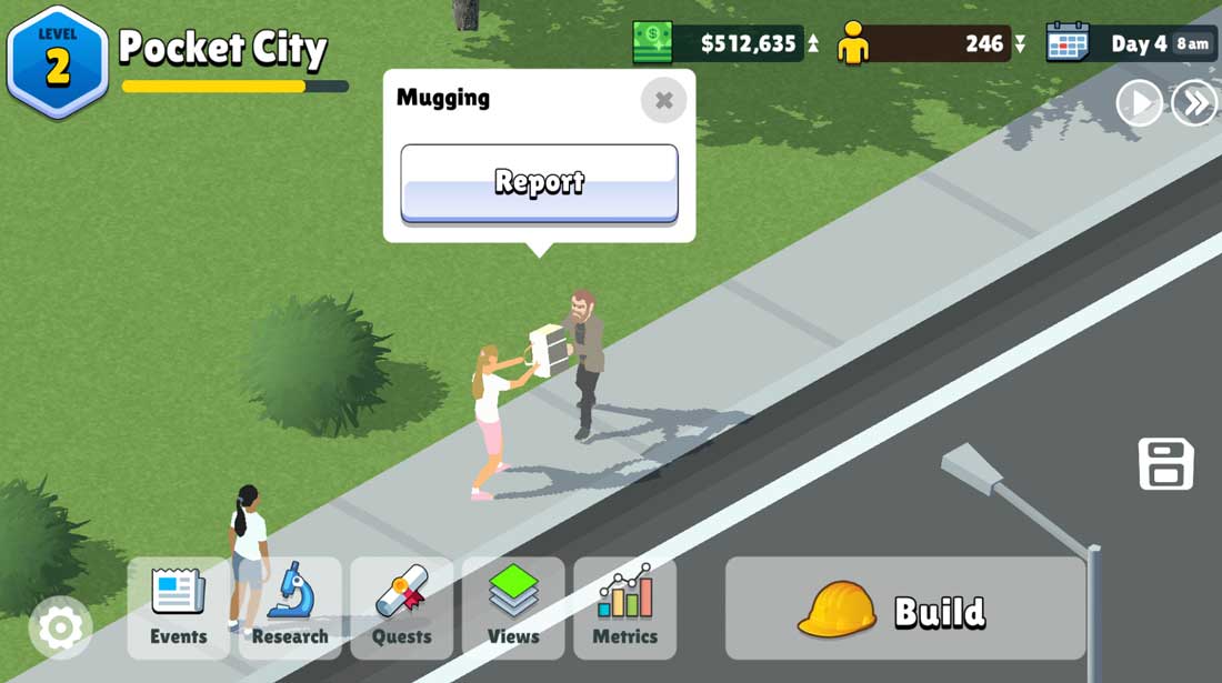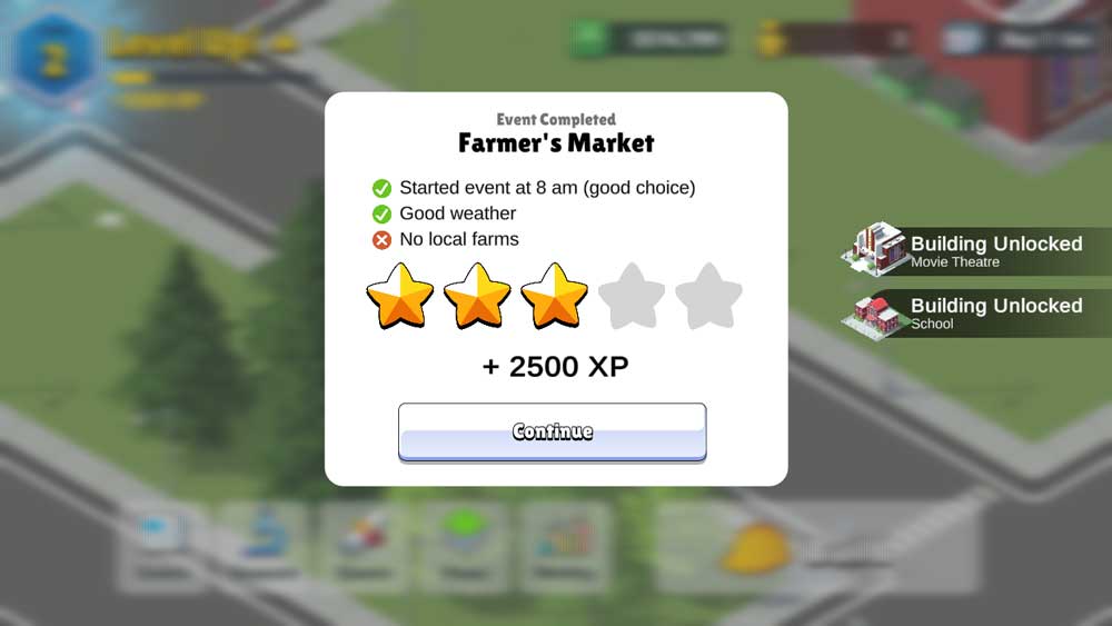 City events make a return in Pocket City 2, this time with improvements. Now, your events will be rated based on various factors. A better event rating will give more XP. For example, a farmer's market will be more successful if it takes place during daytime, during nice weather, and if there are local farms in the city!