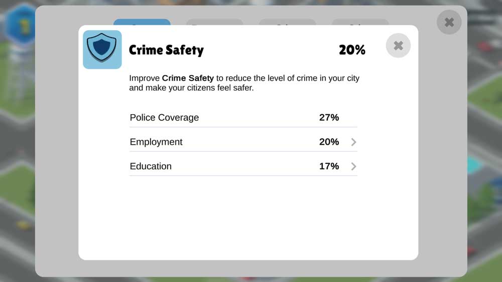 The Stats view from Pocket City 1 is improved, now you can expand individual metrics to see why it has a certain value. Screenshot crime safety.